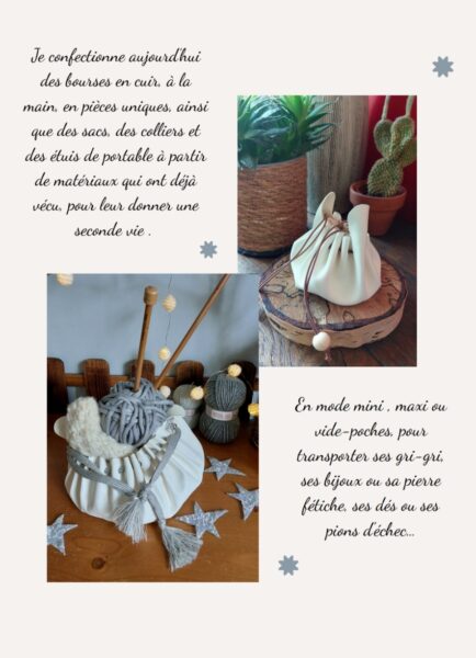 C’est presque par hasard, en créant une petite bourse pour une amie, qu’est née une nouvelle aventure créative… Une évidence. Depuis, elle imagine et réalise à la main des accessoires en tissu et en cuir, pensés comme de véritables objets à offrir, chargés d’émotion et d’attention.