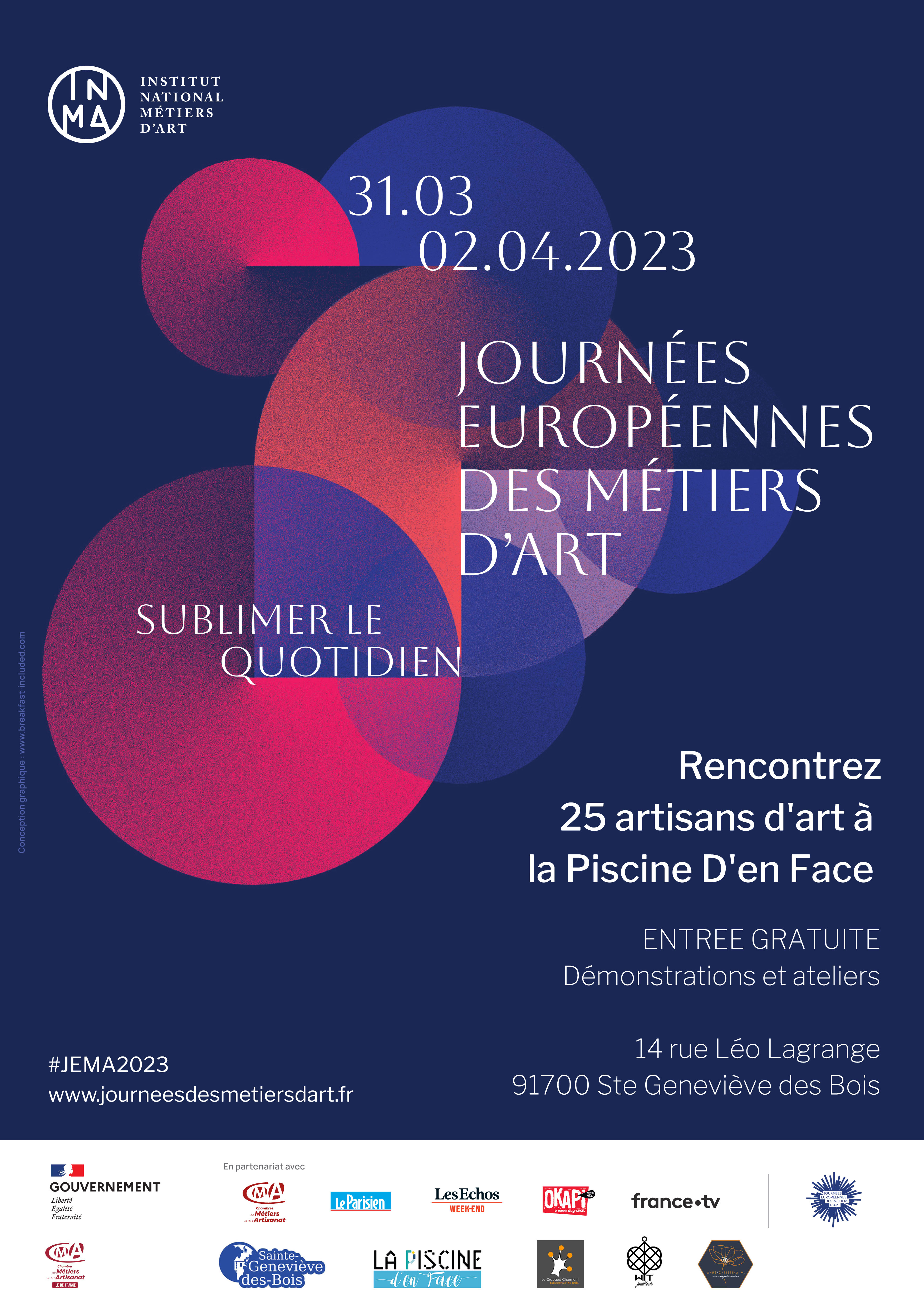 Cette année, j’ai le plaisir de participer aux JEMA, les Journées Européennes des Métiers d’Art. Lors de cet événement, vous aurez l’occasion de découvrir l’univers et les savoir-faire de 25 artisans d’art essonniens, avec au programme des démonstrations (couture sellier par une maroquinière, confection d’un abat-jour en tissu tendu, tournage de bois,…) et des animations d’ateliers.