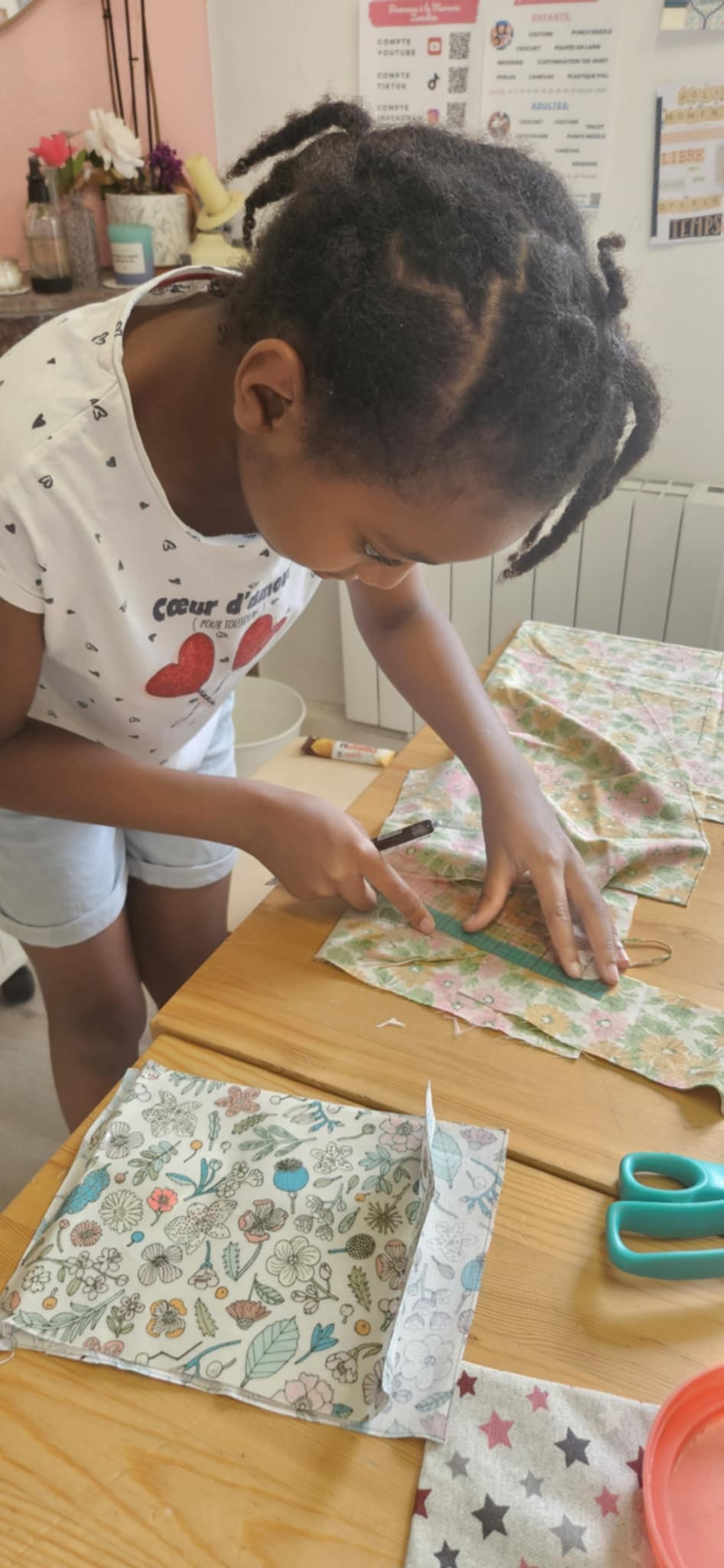 Ma fille suis les ateliers couture avec Julie depuis plus de 2ans. Elle est toujours ravie de passer quelques heures en atelier couture avec Julie, qui s’est se montrer patiente, à l’écoute, pédagogue et bienveillante avec elle. Elle est toujours fière et enjouée de revenir avec son accessoire fait seule comme une grande et c’est toujours avec un grand enthousiasme qu’elle le présente à tout notre entourage. Accessoire cheveux, trousse d’école, bracelet,marque page, cadeau de fête des mères ou décoration de Noël tout y passe pour sa plus grande joie de petite couturière en herbe!