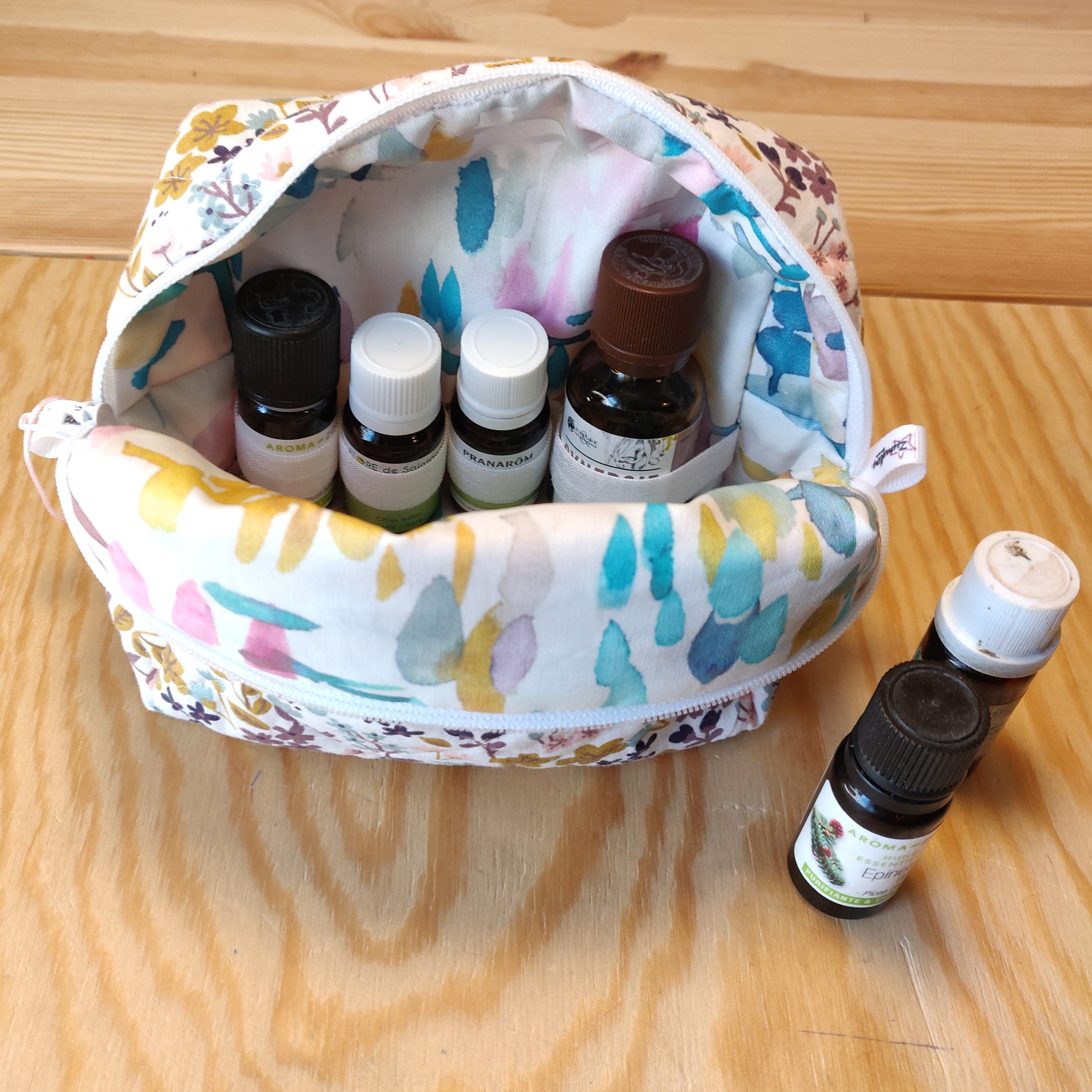 Alors je te propose cette jolie trousse pour ranger tes flacons d'huiles essentielles, tes flacons de fleurs de bach, tes tubes de granules homéopathiques et tout ce que tu veux en plus !