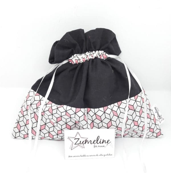 Matériau : tissu coton noir et coton aux motifes géométriques roses et blancs, fermeture avec liens coulissants blancs