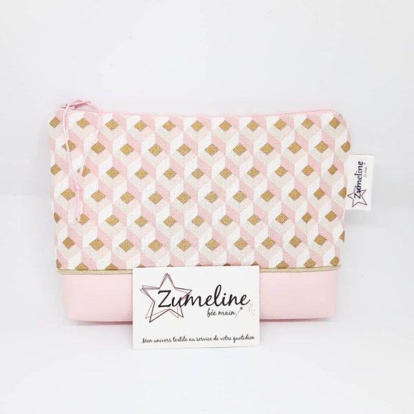 Matériau : simili cuir rose pâle, tissu coton rose et doré aux motifs géométriques, passepoil doré, fermeture rose pâle, doublure intérieure blanche
