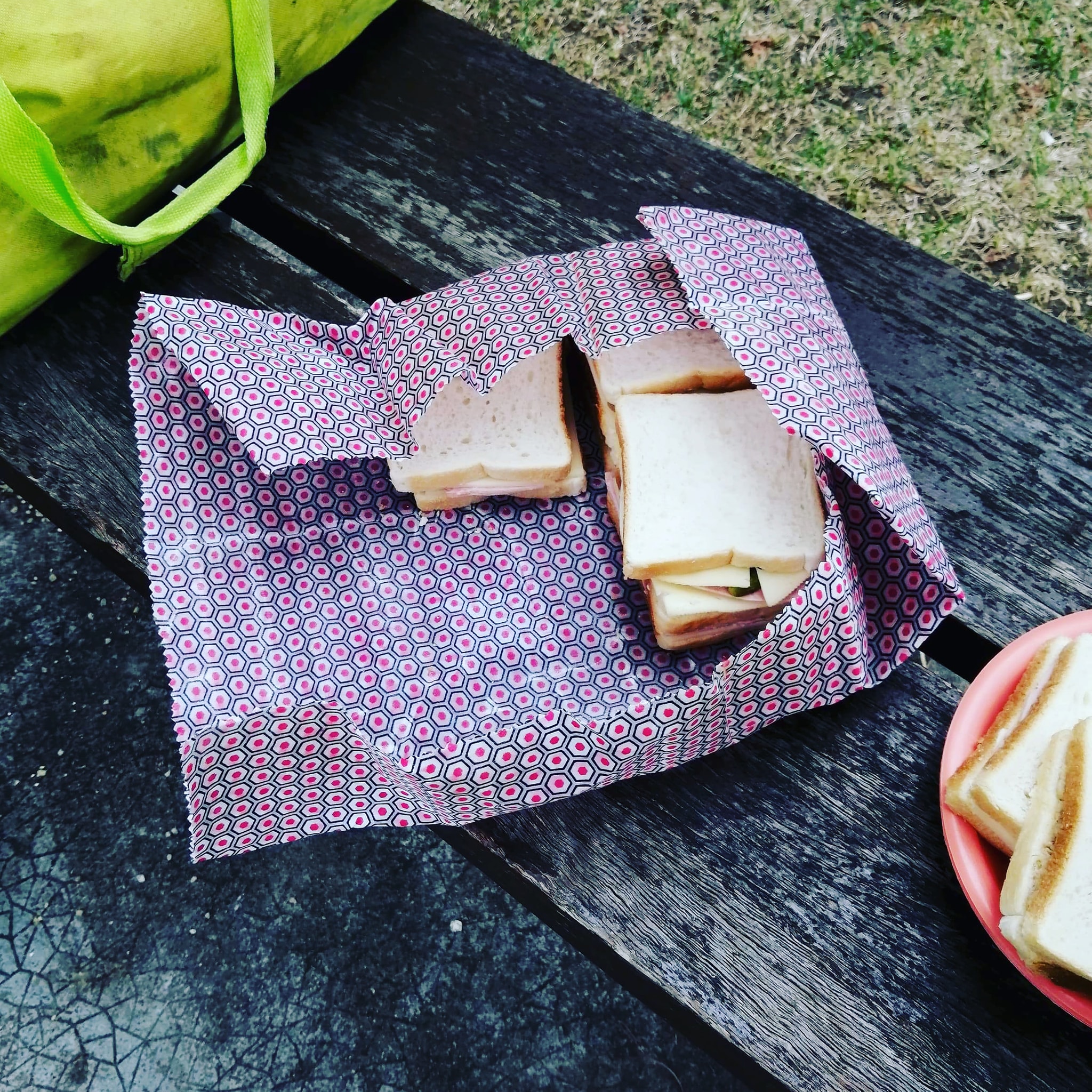 Je suis super contente d’avoir totalement remplacé le film étirable par mes tissus enduits qui sont tout aussi pratiques pour emballer sandwichs, reste de légumes que pour emporter cake ou quiche en pique-nique. Ce petit geste pour la planète a été le premier d’une longue suite de changement dans ma cuisine.