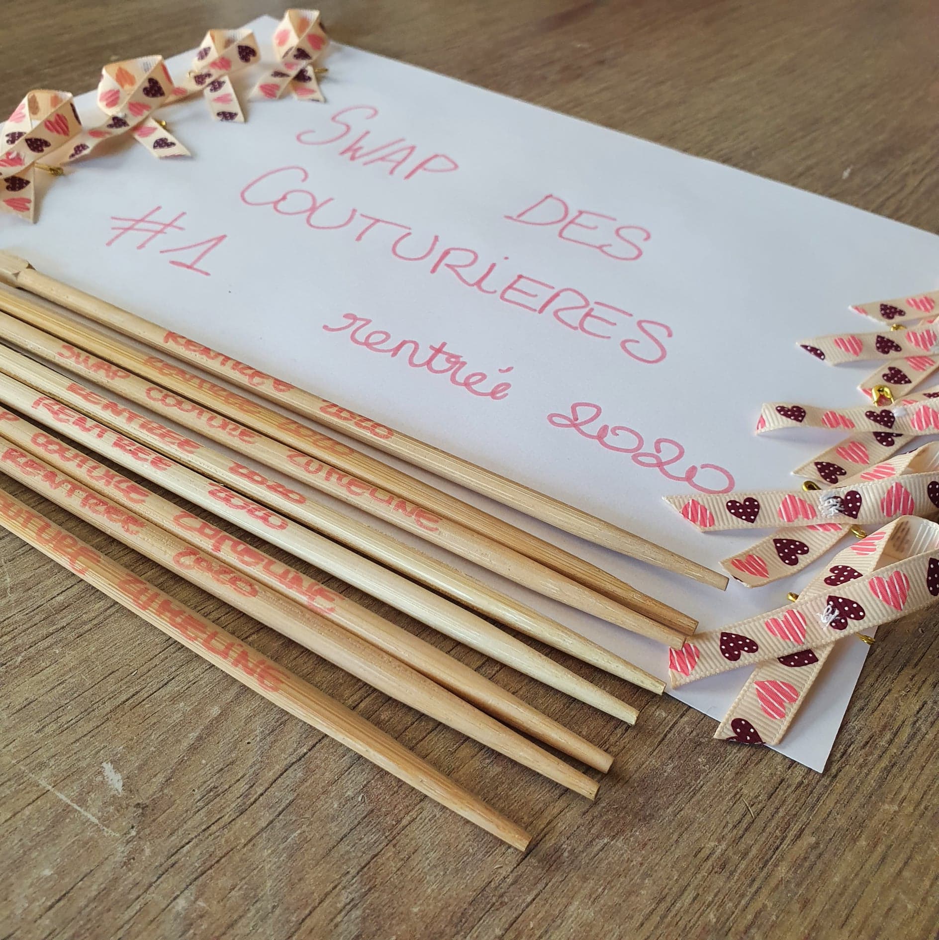 En plus de leur joli paquet, les participantes du swap sont reparties avec une baguette en bois (vous savez, pour avoir des angles parfaits) taguée « swap rentrée 2020 » et une broche « octobre rose », le tout fait par mes petites mains !